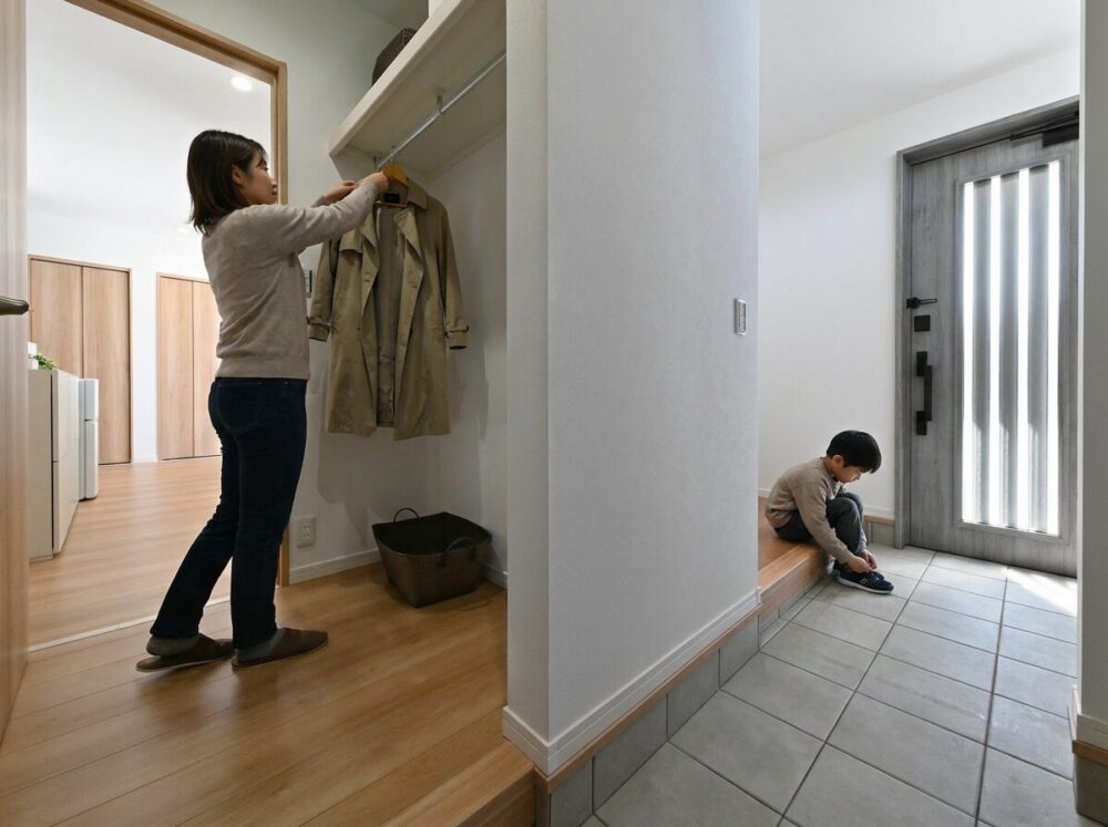 玄関には、家族用と来客用を分けた「2way動線」を採用。家族動線はシューズインクロークを通ってキッチンや洗面室へつながり、帰宅後の手洗いや片付けもスムーズです。