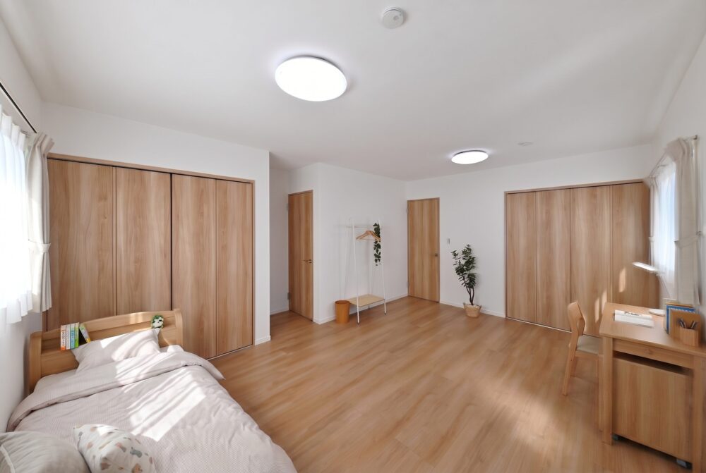 お子様が小さいうちは広々とした遊び場や共有の寝室として使い、成長に合わせて個室が必要になったタイミングで2部屋に仕切るなど、ご家族の成長に寄り添いながら長く快適に暮らせる空間となっています。